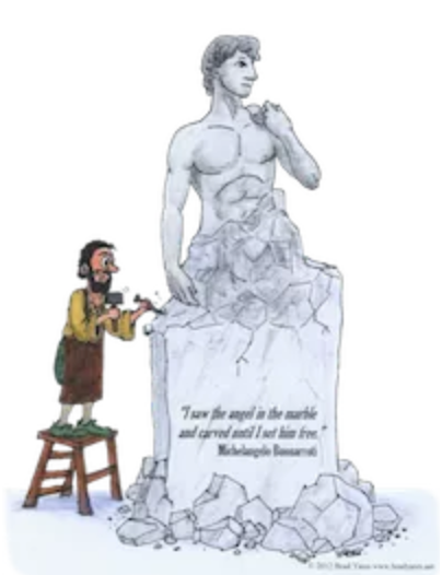 During the event, we’ll use what I call the Michelangelo Process.  When asked how he produced such marvelous sculptures, the brilliant Italian artist responded that he saw the subjects already there – perfect – inside the marble, and that he then just chipped away all the stone that didn’t belong, revealing the masterpiece within.